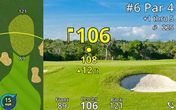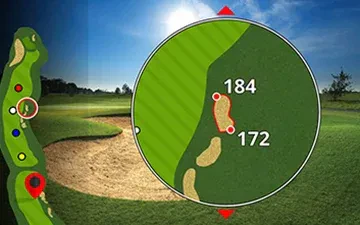 Tækið sýnir þér kort af flötinni vinstra megin á skjánum þegar þú ert að miða á flaggið svo þú sjáir þrjár fjarlægðir að flötinni – næst þér, miðjuna og fjærst þér.