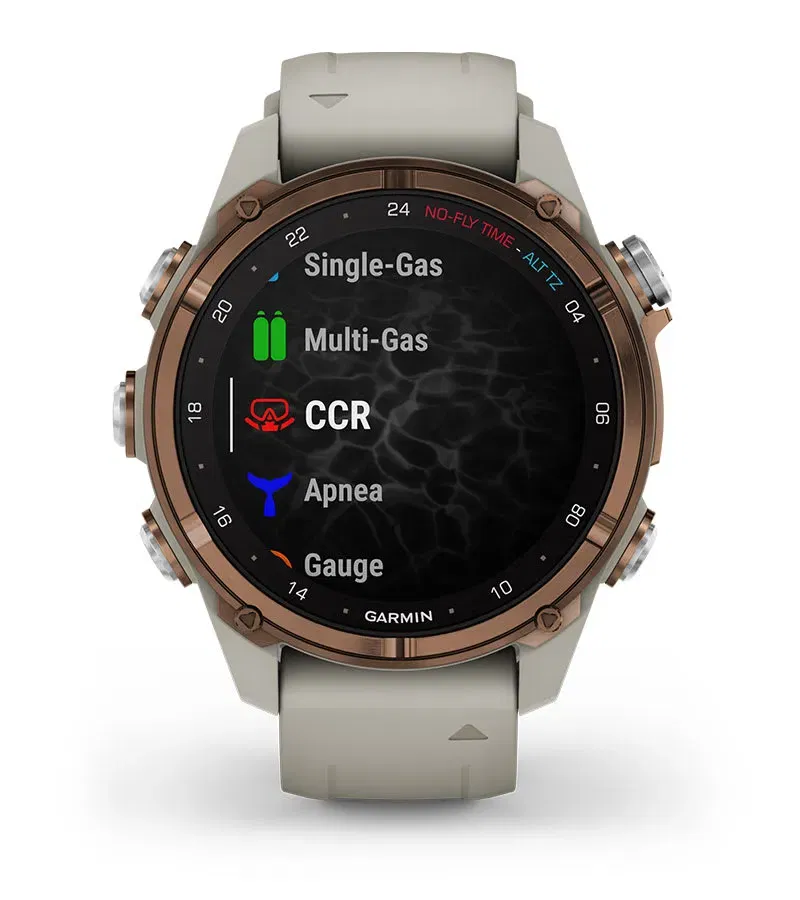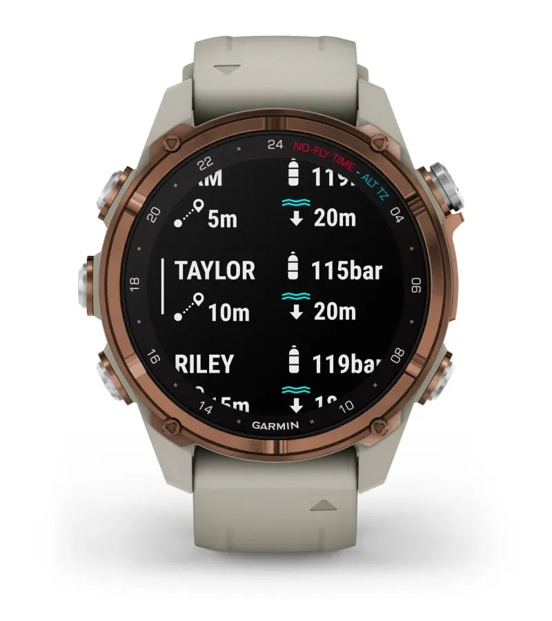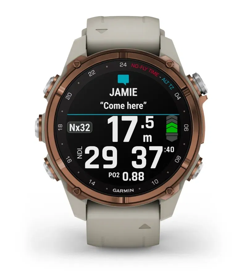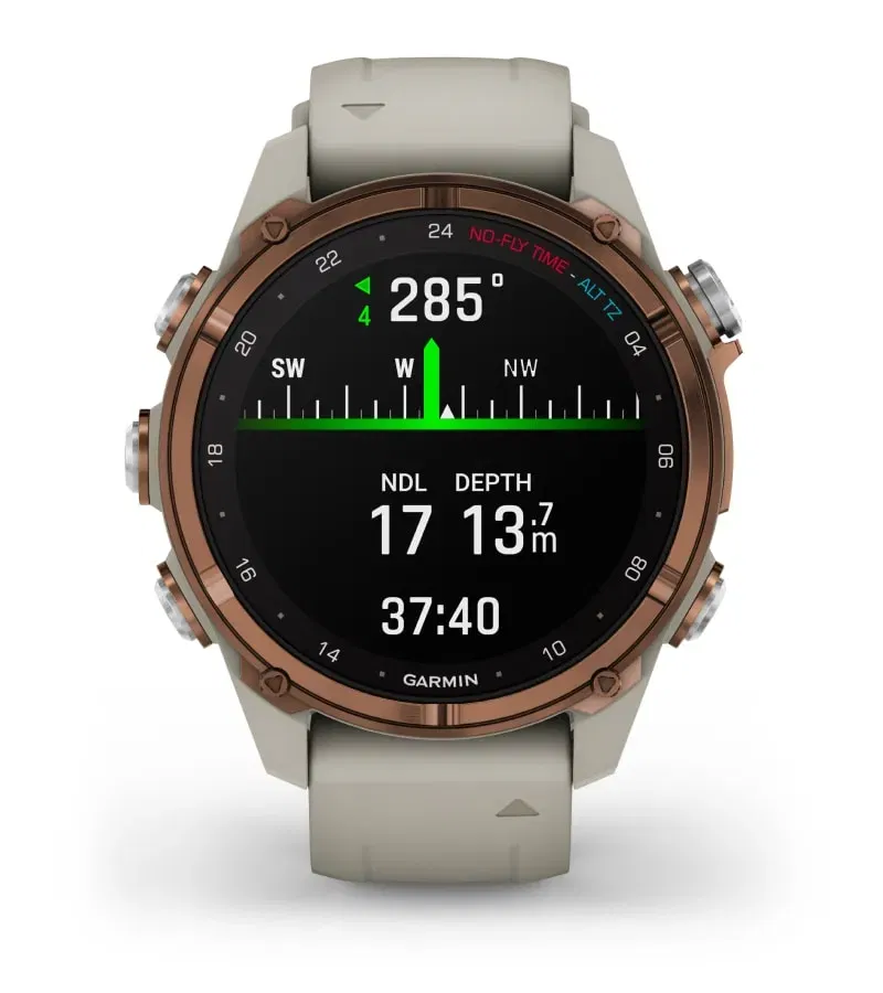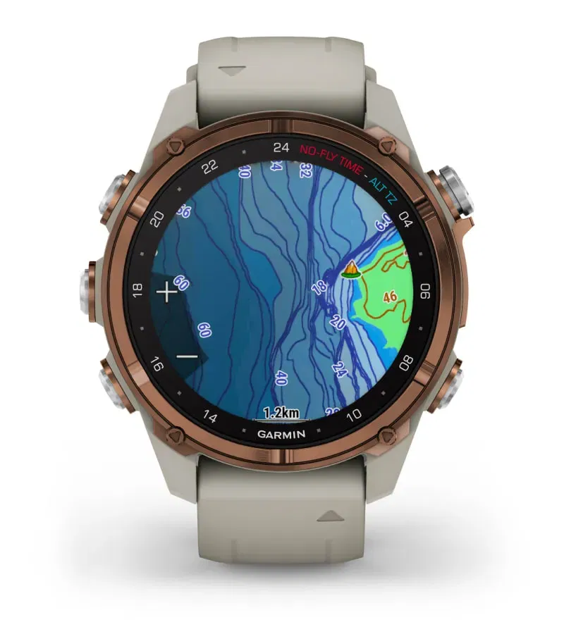 Úrið er með 1,2″ AMOLED snertiskjá, sapphire gleri, 200m vatnsheldni, tökkum og köfunareiginleikum.