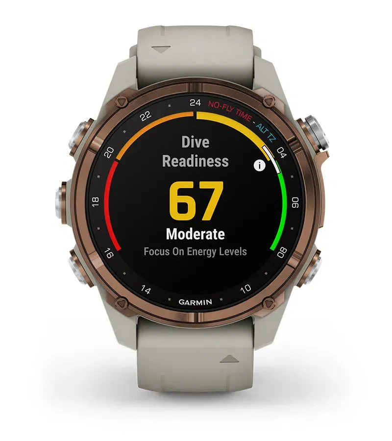 Úrið notar mismunandi þætti í þínu lífi eins og svefn, æfingar, álag, flugferðir og fleira til að áætla hversu klár þú ert í köfun.