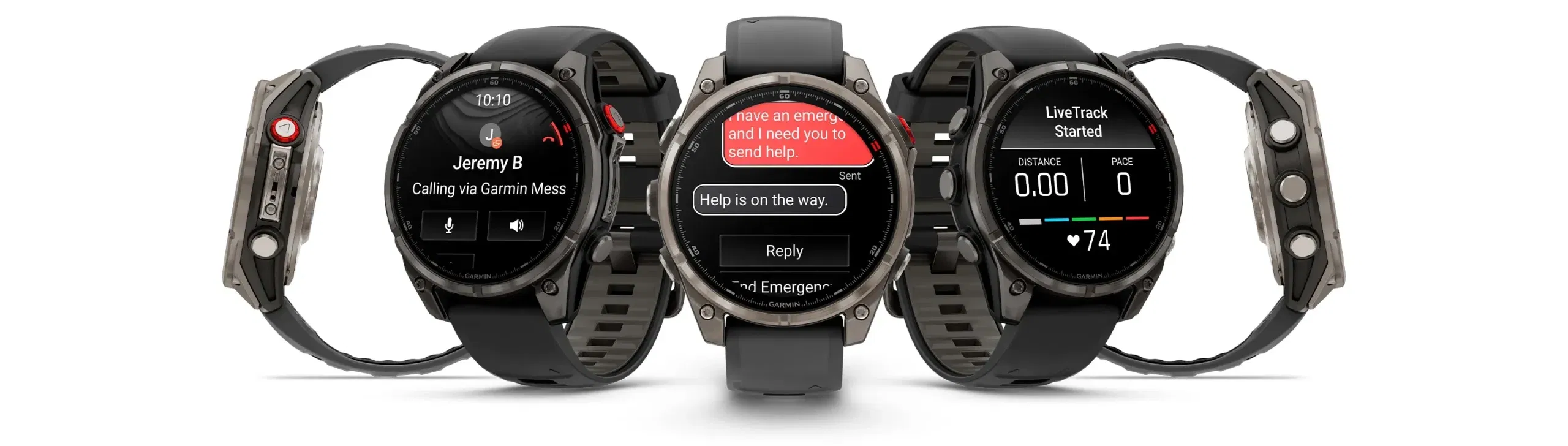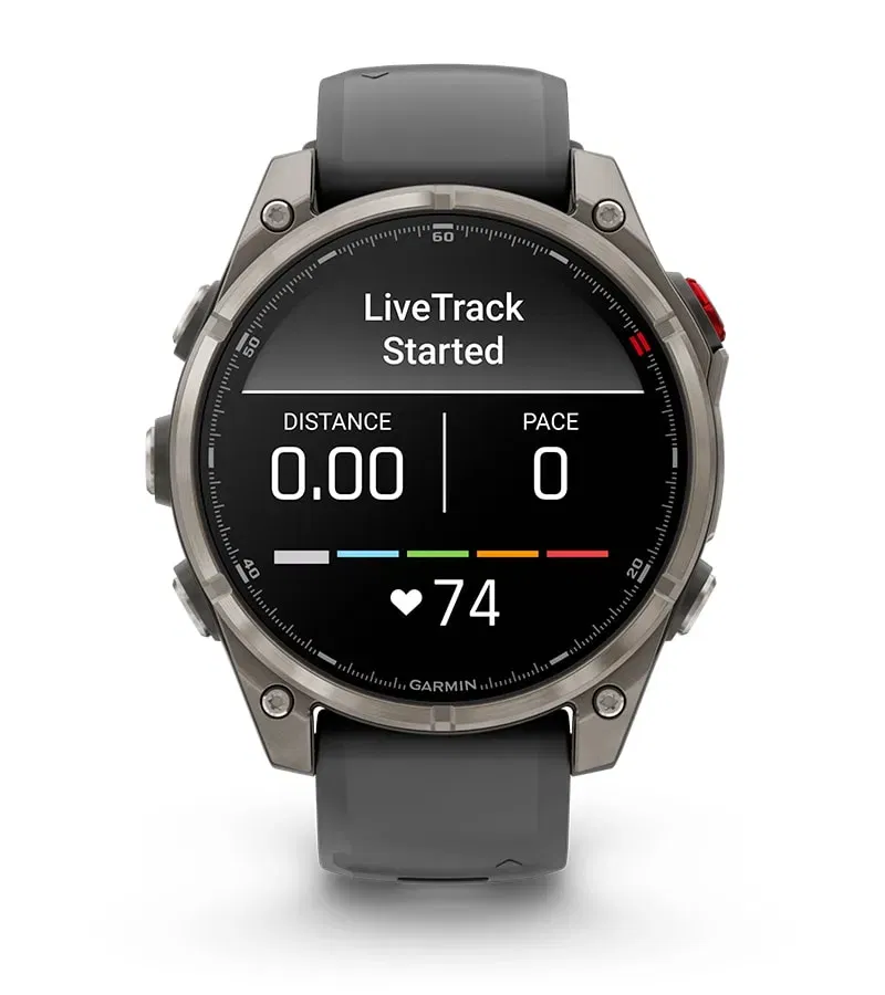 Með LTE-tengingu¹ geta vinir fylgst með ævintýrum þínum í rauntíma í gegnum LiveTrack staðsetningardeilingu með Garmin Messenger appinu í úrinu. Appið gerir þér einnig kleift að láta vini vita þegar þú hefur hafið LiveTrack-deilingu, ef þeir vilja fylgjast með eða ná í þig á meðan þú ert á æfingu.