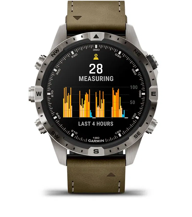 Tveggja mínútna æfing þar sem úrið skráir heilsuna þína; hjartsláttinn², hjartsláttartíðni, súrefnismettun¹, öndun og stress. Úrið býr svo til skýrslu úr þessum upplýsingum sem þú getur deilt með öðrum með Garmin Connect smáforritinu.