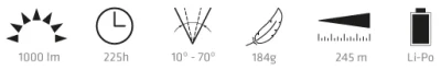 | Lighting Time: | Max 3h / Standard 8h / Dimming 225h |
