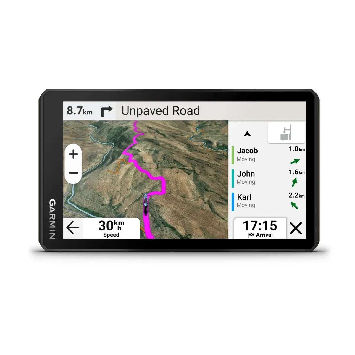 Tækið getur fylgst með allt að 20 ökumönnum. Hægt er að deila staðsetningu og með annaðhvort Tread™ appinu í samhæfum snjallsíma eða með Group Ride sendi (hann þarfnast ekki símasambands).