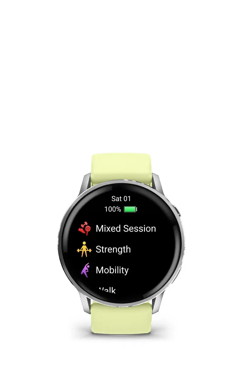 Fylgstu með allri þinni hreyfingu með yfir 80 innbyggðum íþróttaforritum fyrir innan- og utandyra æfingar — þar á meðal göngu, hlaup og margt fleira. Náðu markmiðum þínum með Garmin Coach æfingaáætlunum fyrir hlaup, hjólreiðar, styrktaræfingar og almenna þolþjálfun — sumar þeirra aðlagast jafnvel að líkamsástandi þínu og heilsufarsmælingum. Þú getur líka fengið sérsniðnar æfingatillögur fyrir hvern dag.