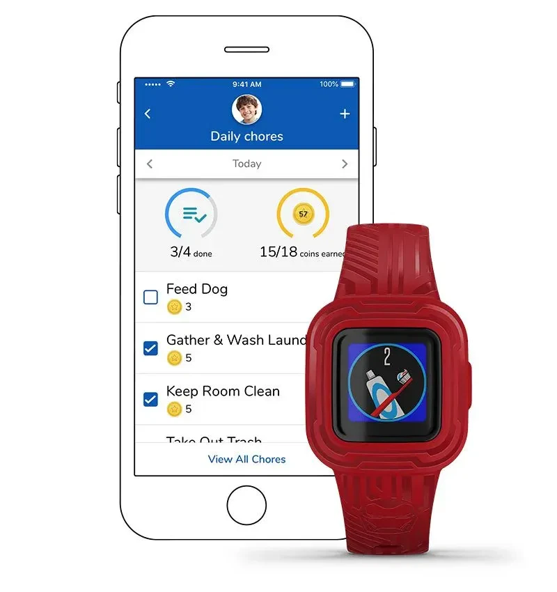 Foreldrar geta sett verkefni í úrið sem barnið getur leyst fyrir verðlaun.